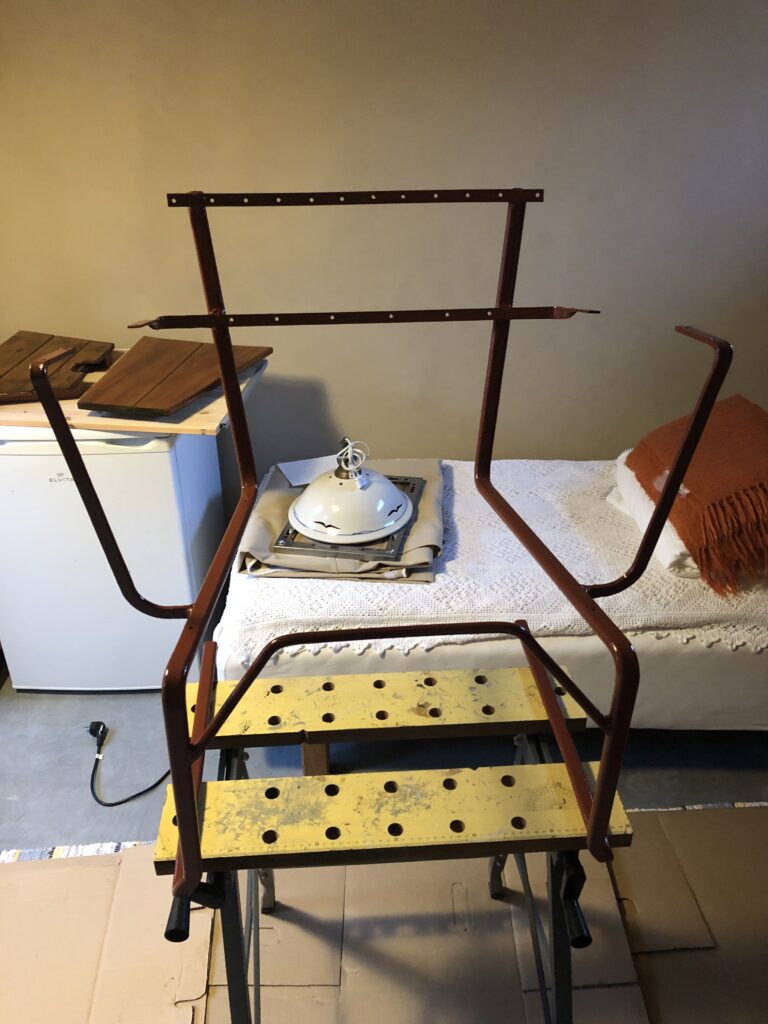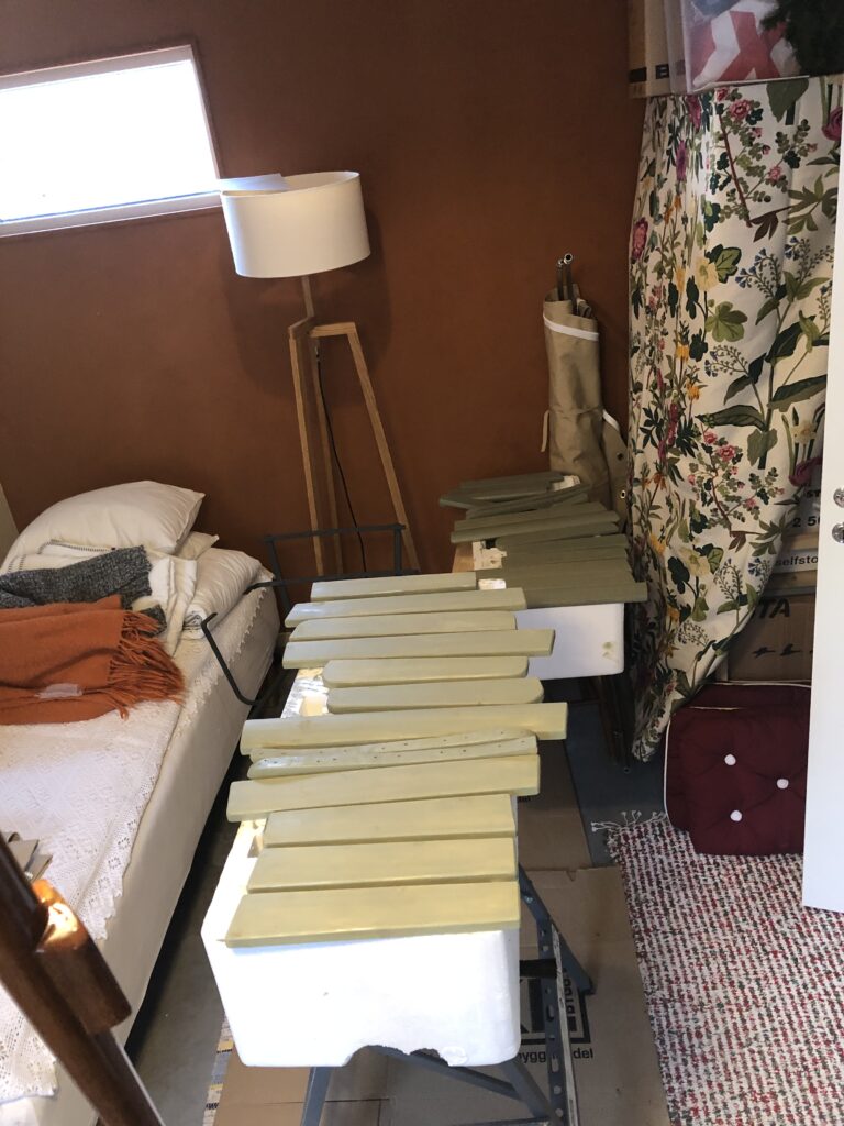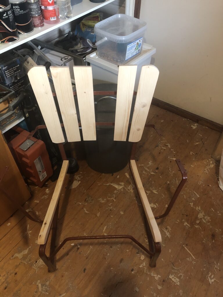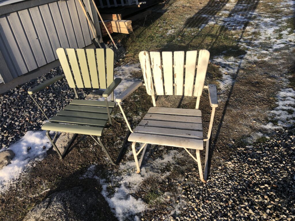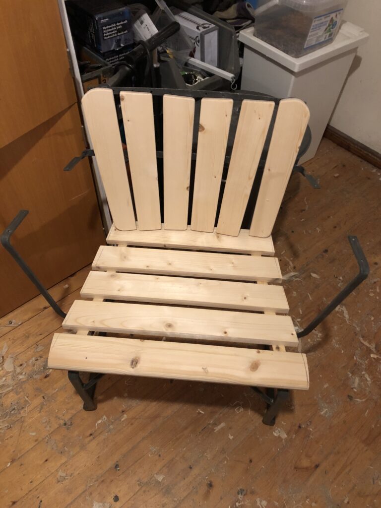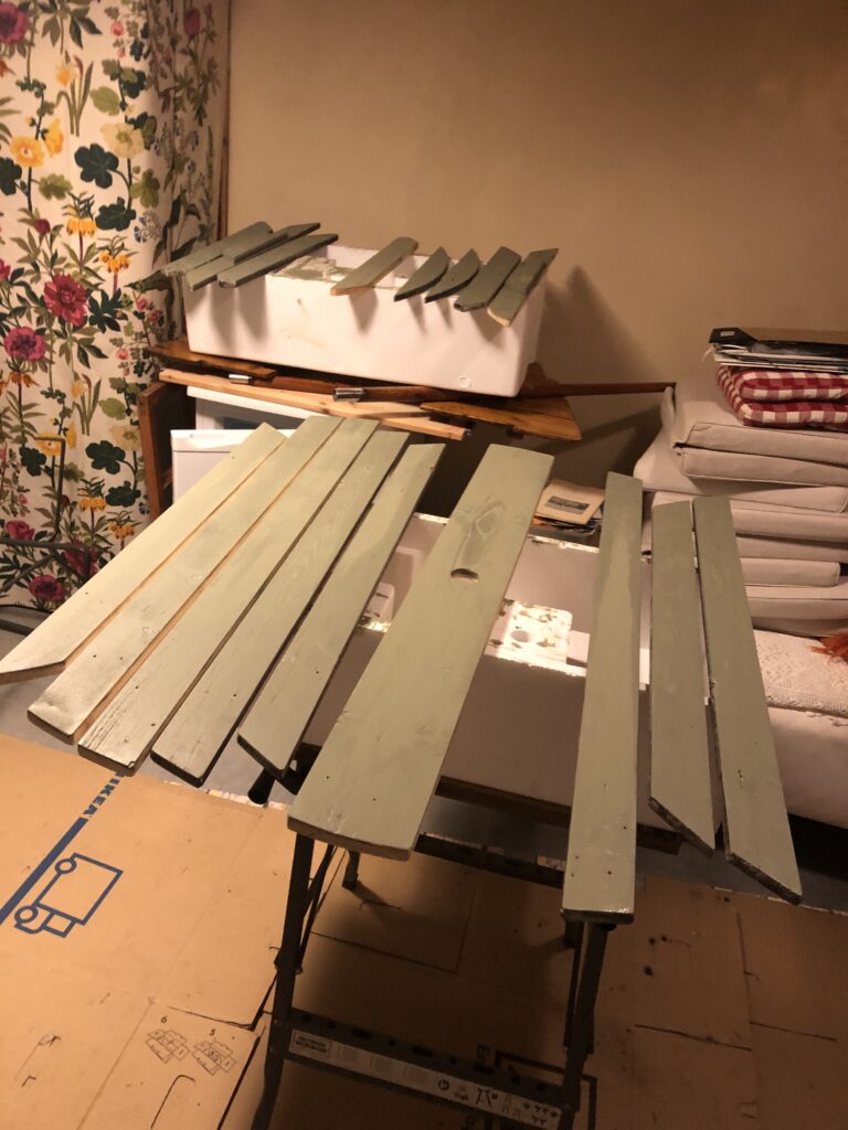 Testar att köpa billig snabbvuxen gran och olja in befintliga trädelar som inte är helt trasiga. Oljar med rå linolja till det känns mättat. Skrapa rent plastfärgen och grunda järnstommen med järnmönja. Måla med Ottossons Antikgrön.
