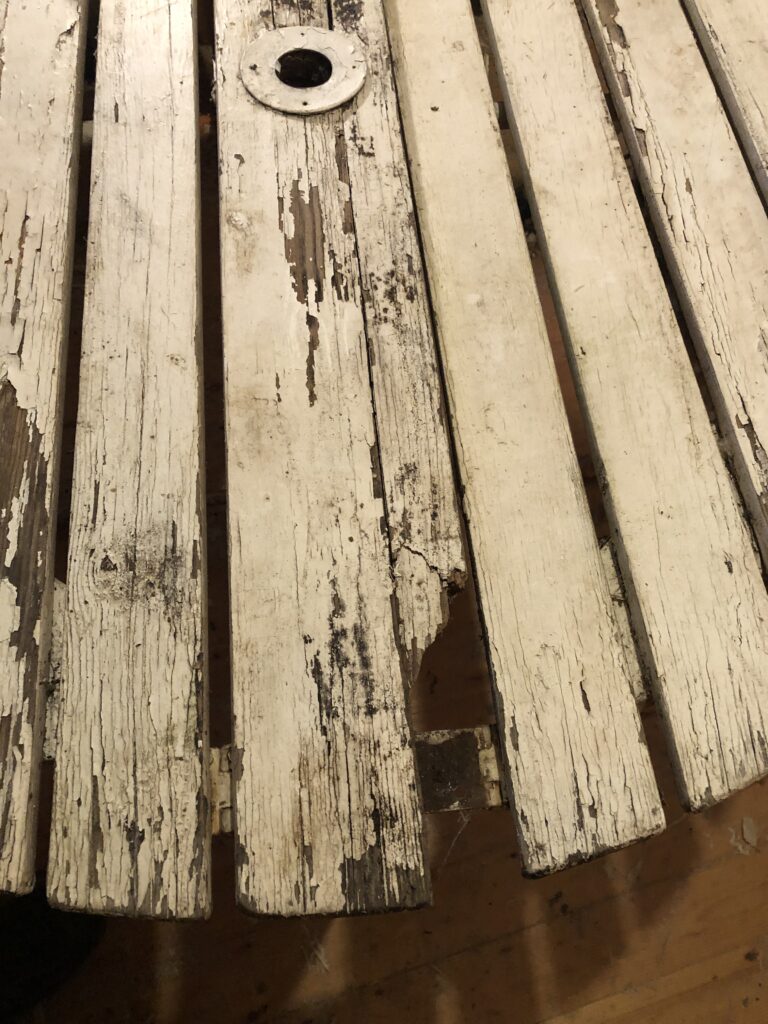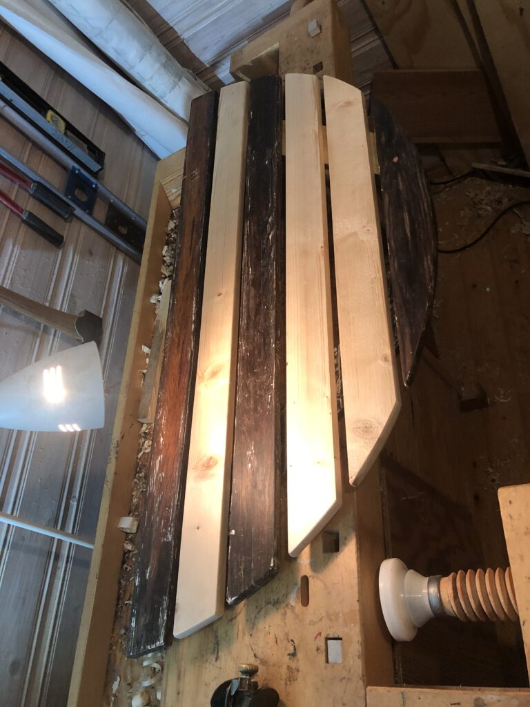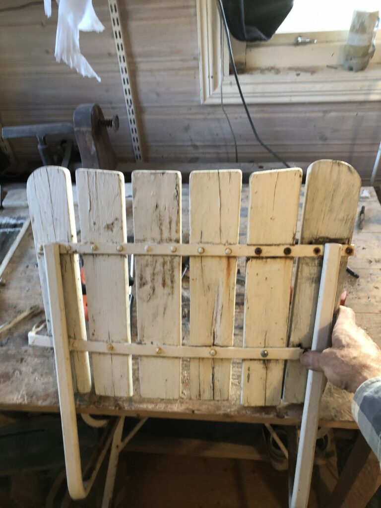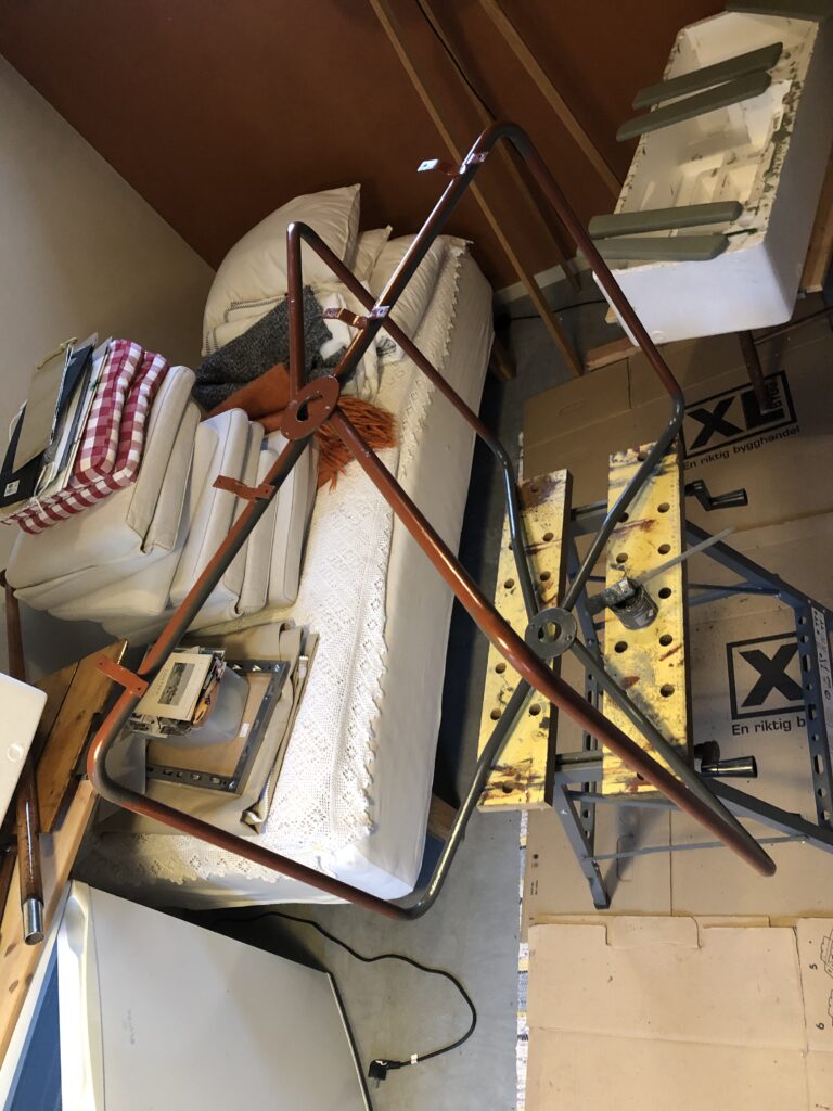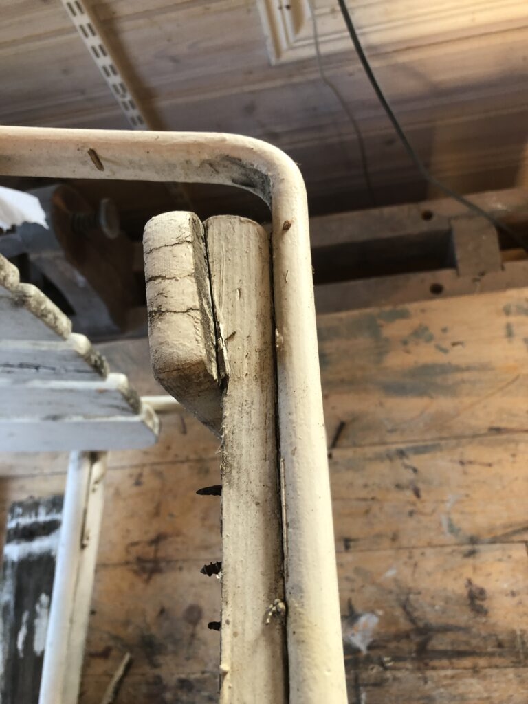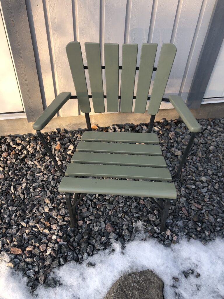 Testar att köpa billig snabbvuxen gran och olja in befintliga trädelar som inte är helt trasiga. Oljar med rå linolja till det känns mättat. Skrapa rent plastfärgen och grunda järnstommen med järnmönja. Måla med Ottossons Antikgrön.
