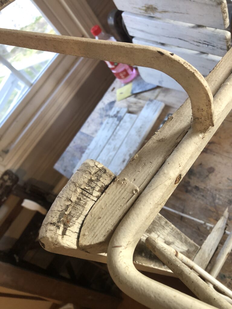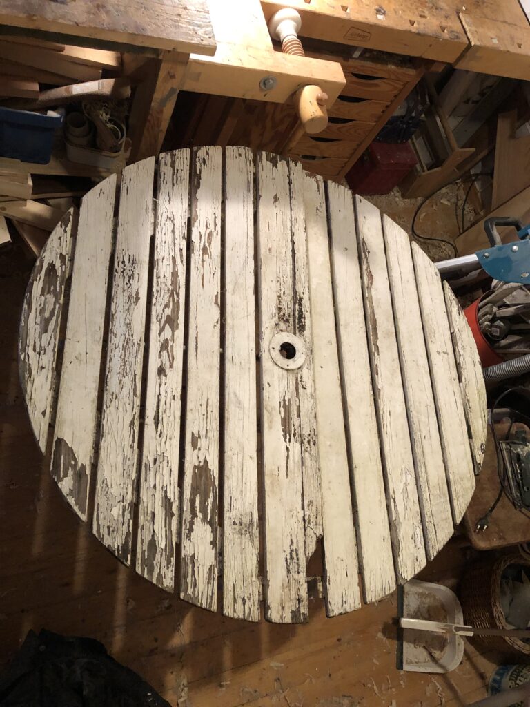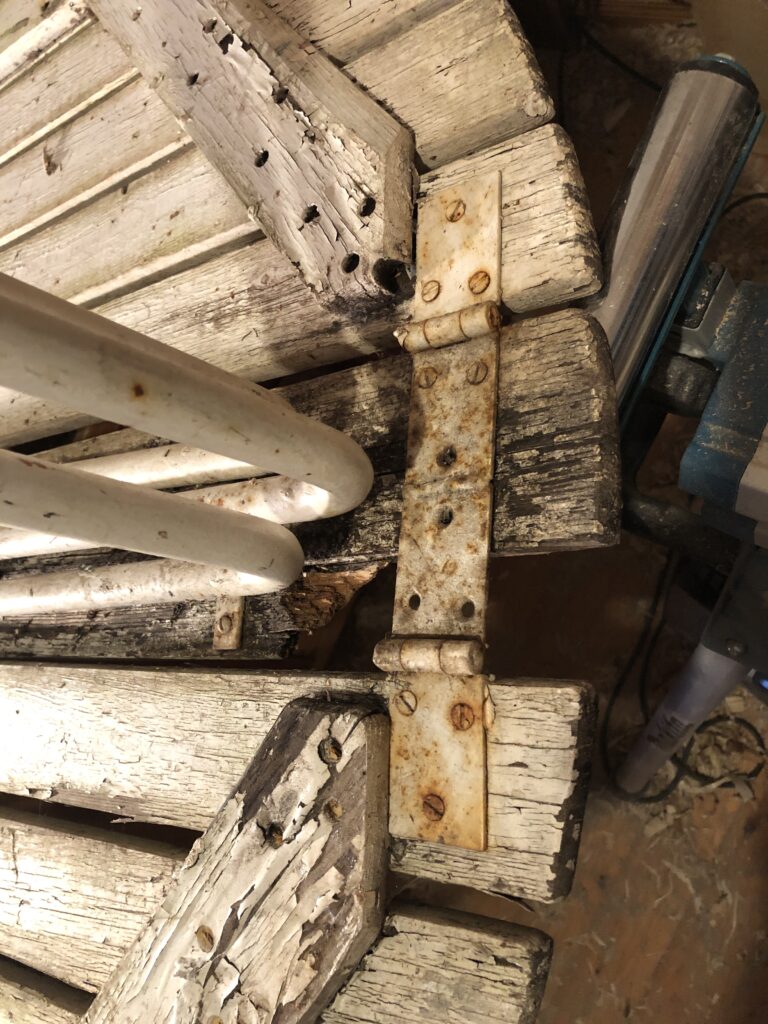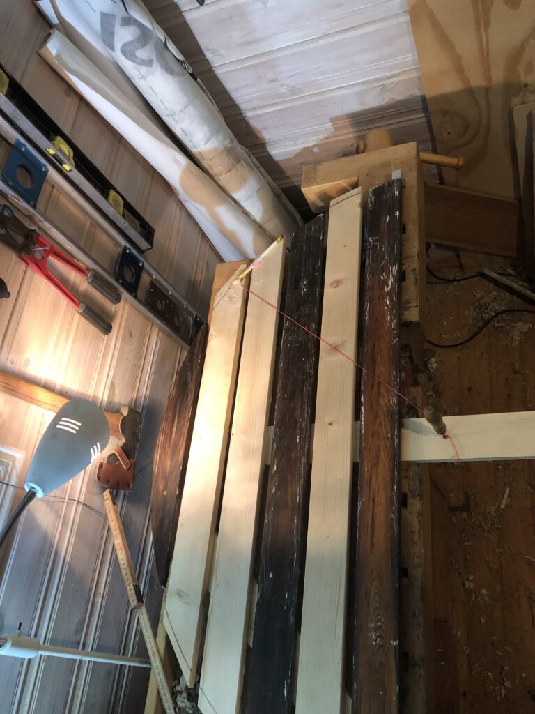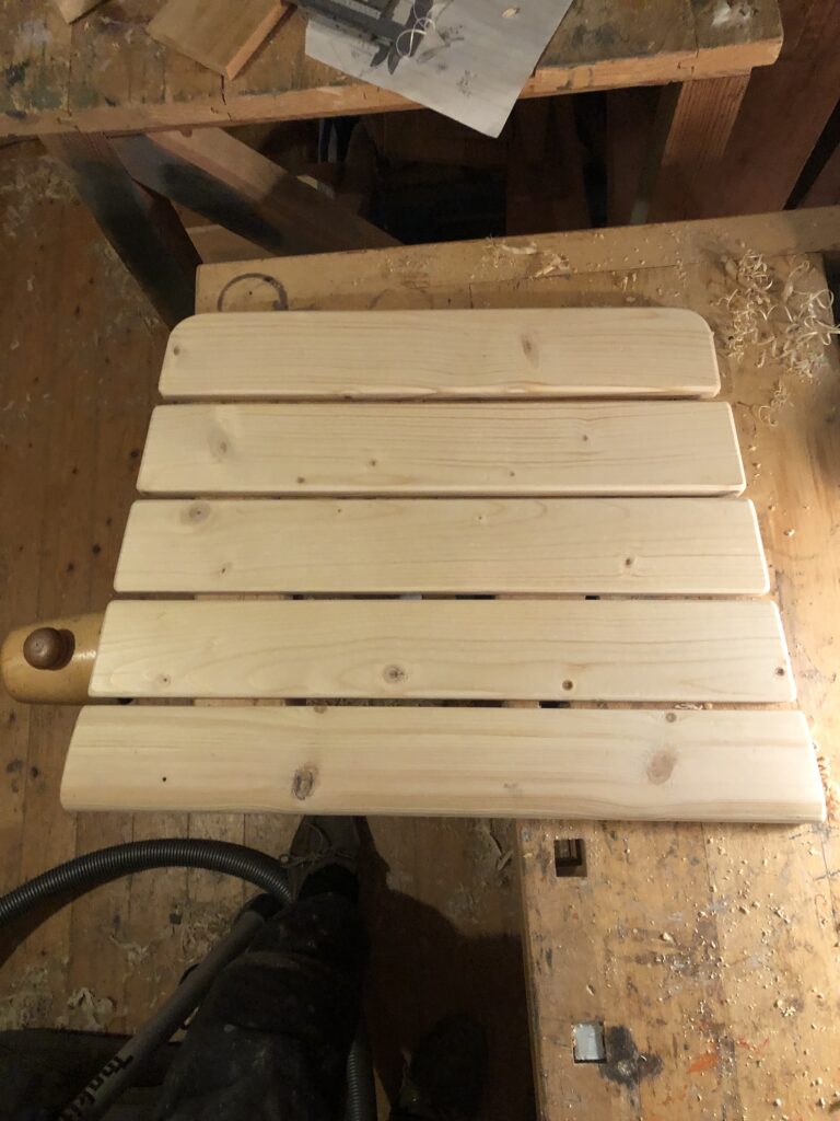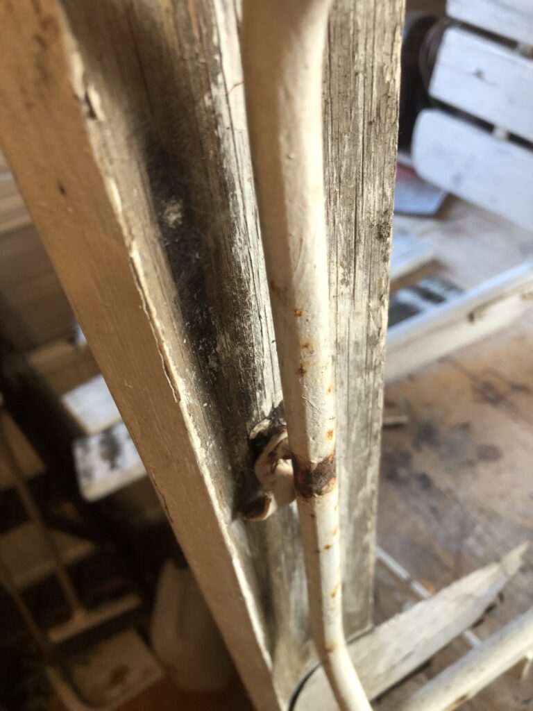 Testar att köpa billig snabbvuxen gran och olja in befintliga trädelar som inte är helt trasiga. Oljar med rå linolja till det känns mättat. Skrapa rent plastfärgen och grunda järnstommen med järnmönja. Måla med Ottossons Antikgrön.